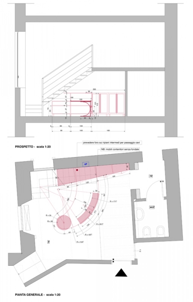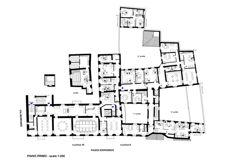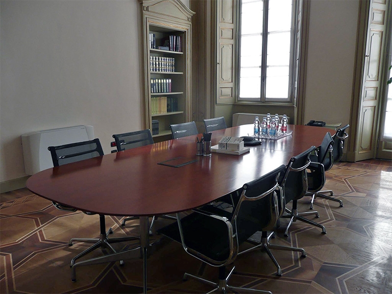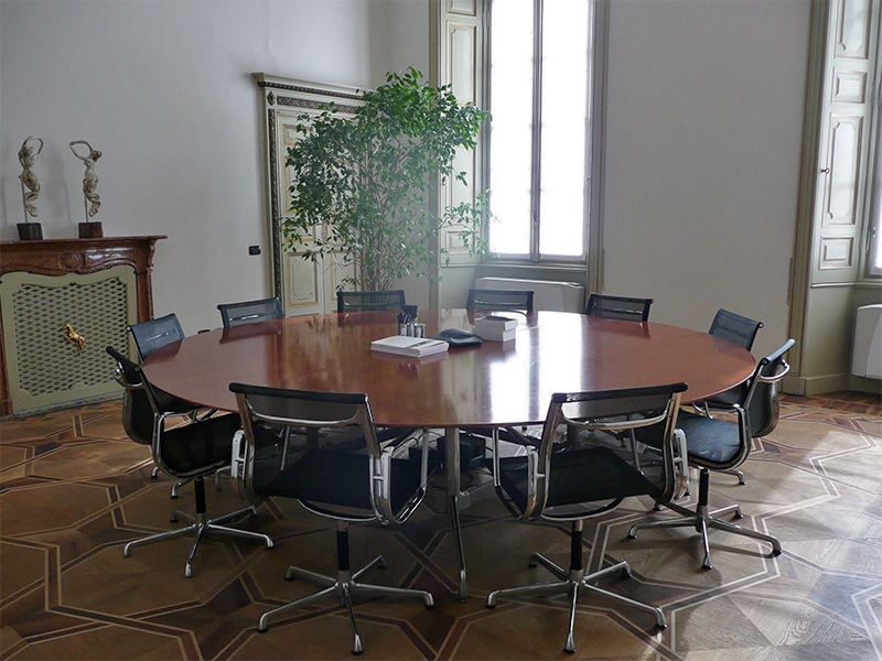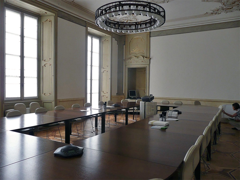 Le soluzioni proposte ricercano sempre un’integrazione tra le esigenze di conservazione delle strutture architettoniche esistenti e la creazione di moderni spazi di lavoro efficienti e dinamici. La contingenza di intervenire all’interno di un immobile di grande valenza architettonica per la creazione di spazi lavorativi non viene vista come limite bensì come costante stimolo a ad una continua ricerca di soluzioni di equilibrio e compatibilità fra il rispetto e la conservazione dell’involucro e le esigenze derivanti dalla funzione direzionale. Questa attenzione è posta in ogni soluzione progettuale, indipendentemente dalla scala d’intervento: dal restauro mirato di imbotti ed ante delle antiche porte lignee, alla formazione di nuovi spazi di lavoro attraverso la redistribuzione e ripartizione degli ambienti esistenti. Così, ad esempio, la divisione di una stanza con soffitto finemente decorato ad affresco e delimitato da una cornice modanata è stata risolta inserendo nella parte sommitale della parete divisoria una fascia vetrata che ha consentito di salvaguardare l’integrità fisica (materica) e visiva del prezioso apparato decorativo.