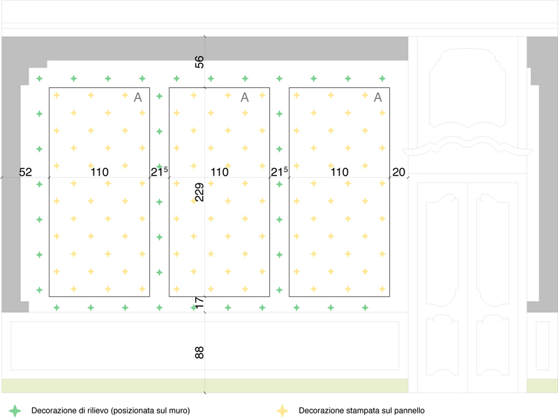 Per la sala più grande si è deciso di intervenire con pannelli fonoassorbenti utilizzando uno speciale tessuto teso sul quale è stato stampato lo stesso disegno che decora, in bassorilievo, tutte le pareti della sala.