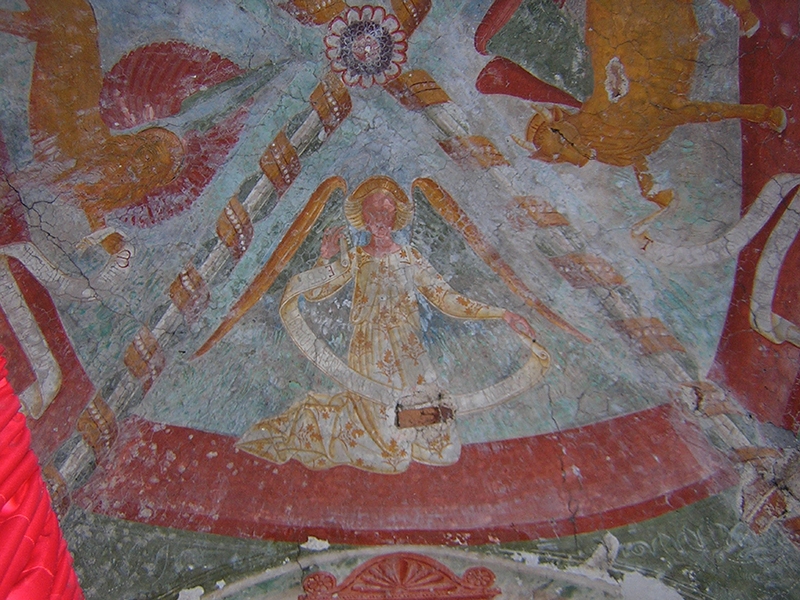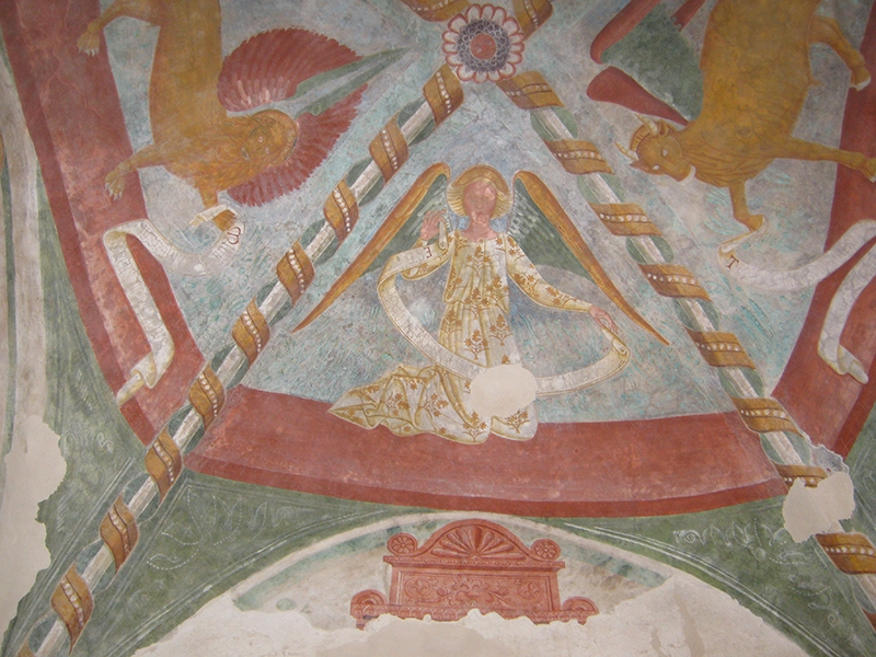 - il consolidamento del sistema di copertura (posa di un dormiente ligneo perimetrale, sostituzione di elementi non recuperabili, consolidamento del punto di appoggio della trave principale del tetto dell’abside);