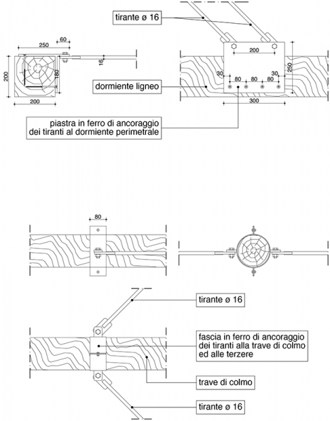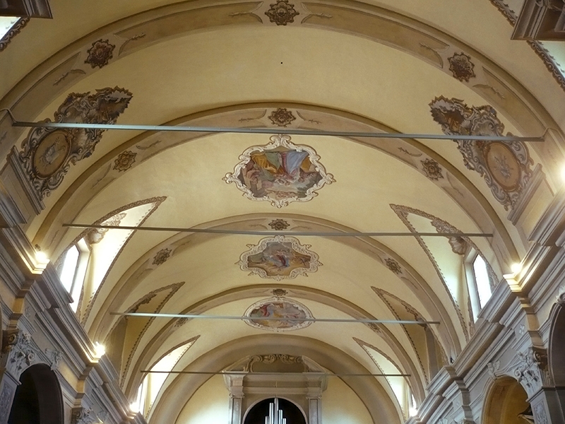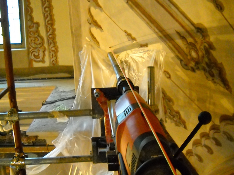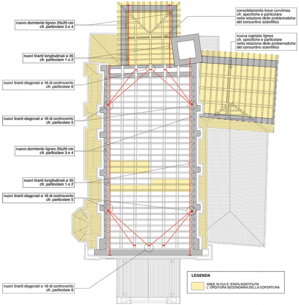 - la posa di nuovi tiranti di facciata, nel sottotetto al fine di migliorare il collegamento tra facciata, chiesa ed abside e la posa di tiranti di contenimento per evitare il martellamento della trave di colmo;