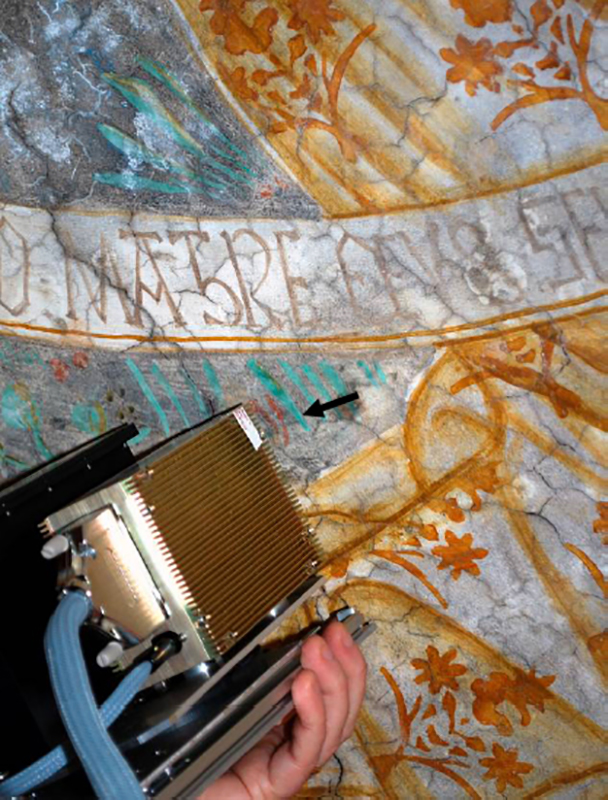 I preziosi dipinti trecenteschi che ornano la volta a crociera e due pareti della cappella sono stati oggetto di un restauro preceduto da una attenta analisi dei dipinti. La tecnica non invasiva impiegata in situ per l’analisi delle superficie pittoriche è la fluorescenza ai raggi X (XRF) che consente la caratterizzazione dei pigmenti, delle cariche e dei leganti minerali.