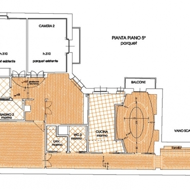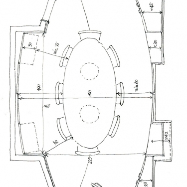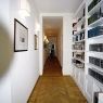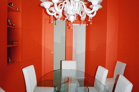 Per la nuova sala da pranzo si è realizzata una stanza ovale interamente rivestita di boiserie in legno di un bel colore rosso acceso e comunicante con la cucina attraverso un passavivande. Sono stati necessari lavori di rinforzo strutturale dei solai con l’inserimento di putrelle in acciaio che hanno comportato un rialzo nella zona centrale dell’appartamento.