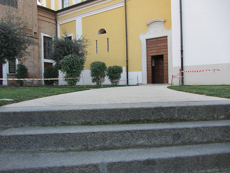 - Sagrato nord. I successivi lotti di lavoro hanno interessato la sistemazione del sagrato nord che rappresenta l'accesso storico alla chiesa, caratterizzato dall'antica scalea a due bracci curvilinei ed ornata da una balaustrata in cemento. La situazione di forte degrado dei singoli elementi della balaustrata, la sconnessione dei gradoni e la marcata eterogeneità dei materiali dei percorsi esistenti hanno portato ad un progetto generale dello spazio pubblico del sagrato parrocchiale. L'intervento oltre al recupero ed al restauro dell'antica balaustrata e della scalea ha comportato la posa di una nuova pavimentazione in calcestruzzo architettonico realizzata ad hoc, in accordo con la Soprintendenza, dialogante in modo armonico con l'esistente e con la pavimentazione della nuova piazza pubblica dedicata a S. Paolo.