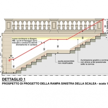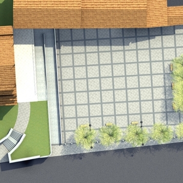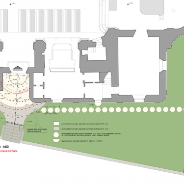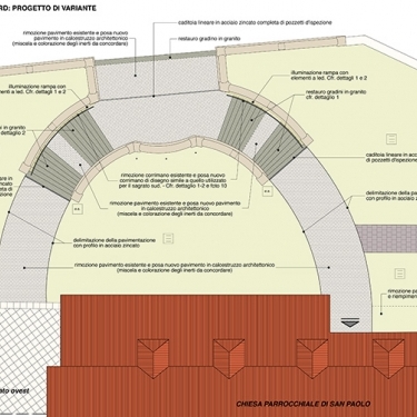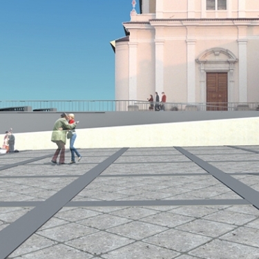 La rimozione della rampa carrabile e della scala centrale consentirebbe infatti di realizzare un nuovo collegamento tra lo spazio collettivo privato (sagrato) e lo spazio collettivo pubblico (piazza): il nuovo percorso non entra in antagonismo con la scalinata storica, non è una semplice rampa per persone con handicap, ma rappresenta un nuovo modo di risolvere l’accessibilità liberando spazio all’interno della piazza.