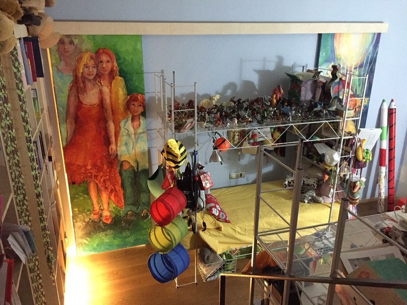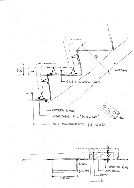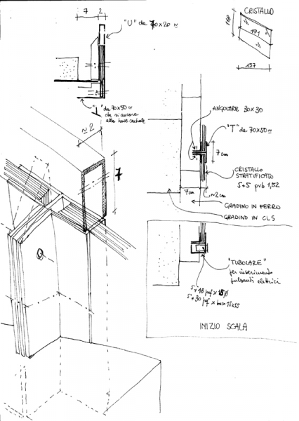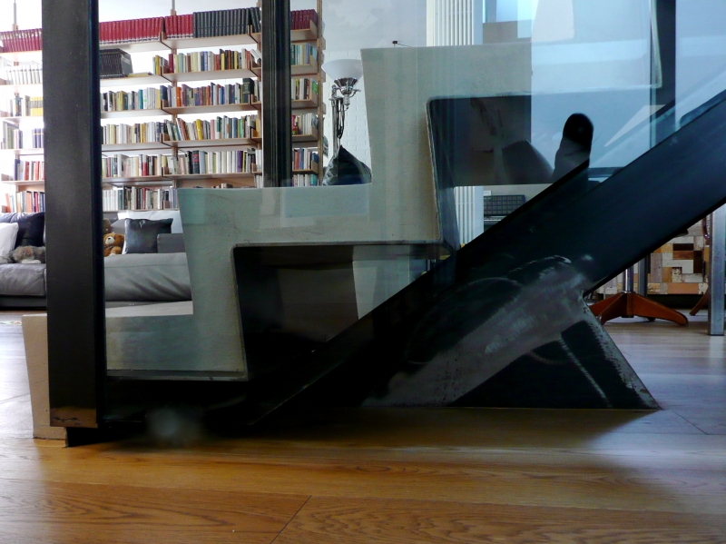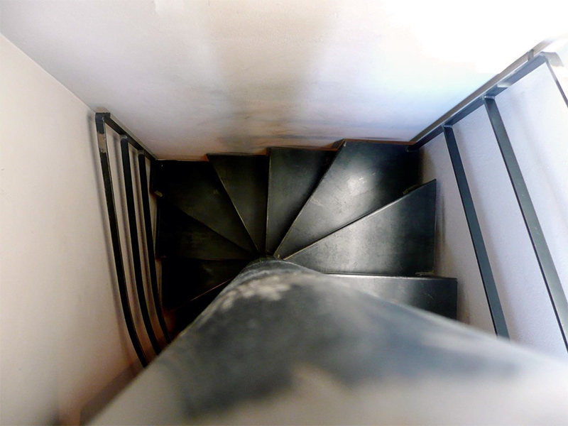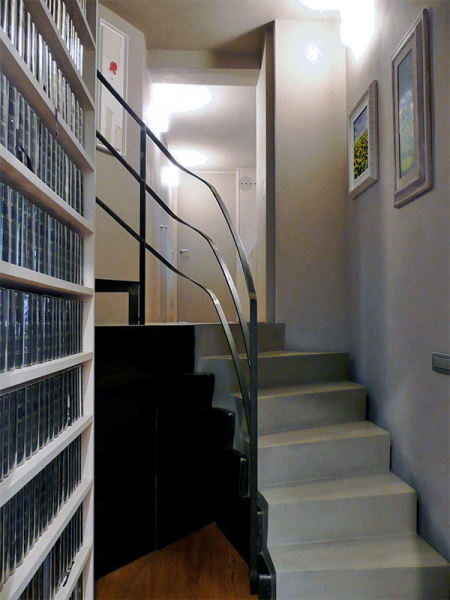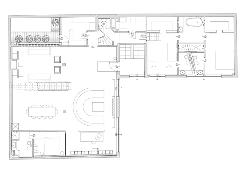 Al centro del loft si sviluppa una scala rettilinea realizzata a disegno che divide trasversalmente il grande locale e porta al piano superiore, dove all’interno di una serra è collocata la cucina ed un pranzo più privato. La cucina tramite la trasparenza del ferro e vetro comunica direttamente con l’esterno; un sistema di brise-soleil in alluminio consente la schermatura dai raggi solari. La zona notte si trova oltre un’ala rialzata nei pressi dell’ingresso ed è composta da 2 camere e 2 bagni dedicati; tramite una scala a chiocciola lo spazio principale è collegato ad una seconda serra dove si trova la zona fitness.