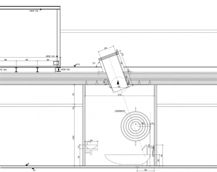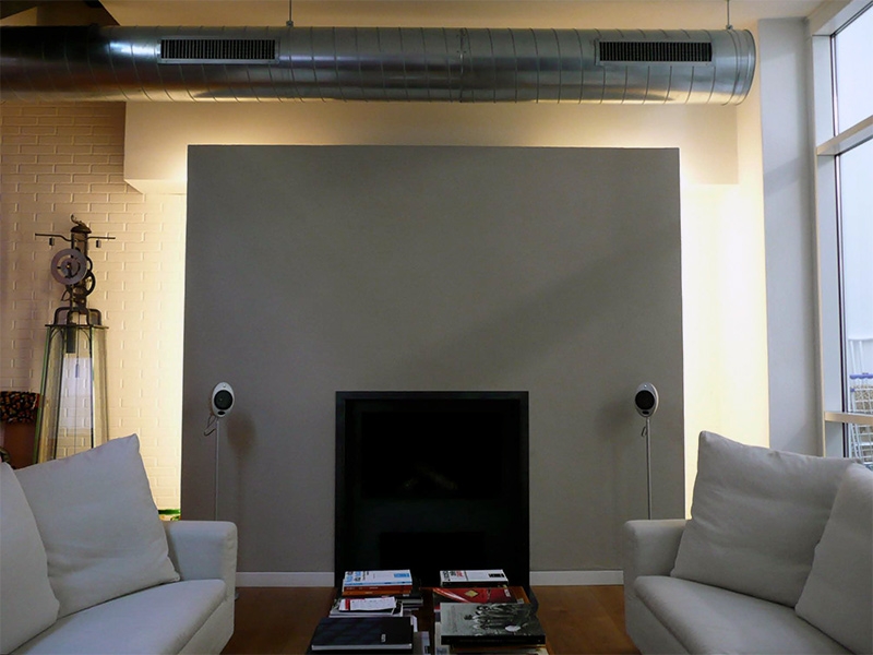 Nella ristrutturazione particolare attenzione è stata posta allo studio degli impianti, cercando di mediare il più possibile tra tecnologia, estetica e limitazioni di carattere strutturale. La parete confinante con l’esterno ha un riscaldamento radiante integrato da termosifoni funzionanti a bassa temperatura. Di particolare effetto risultano gli imponenti tubi metallici dell’impianto di condizionamento che attraversano trasversalmente il loft.